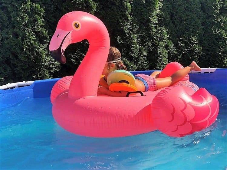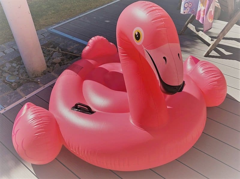 Bevor die Meute so gegen 16.30 Uhr wieder eintrudelt, pumpe ich noch schnell unseren neuen Flamingo auf, weil ich ML versprochen haben, sie darf noch in den Pool und das neue Tier ausprobieren.