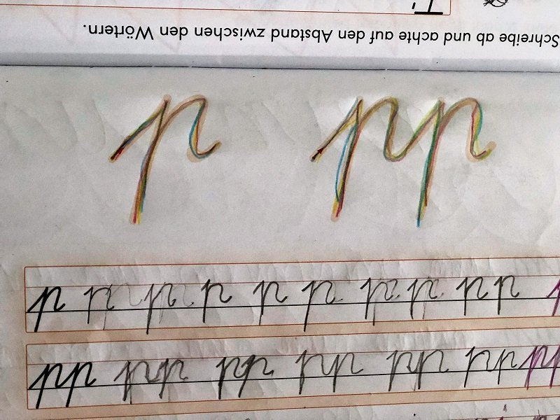 Sie hatte wieder Schreibschrift auf. Heute war das P dran und sie mag es nach wie vor nicht, Zeile für Zeile das Gleiche zu schreiben. Habt ihr das Schreibschrift p schon mal gesehen. Das sieht ja ganz anders aus, wie zu meiner Zeit. Irgendwie komisch. Bei uns war das unten zu, oder?