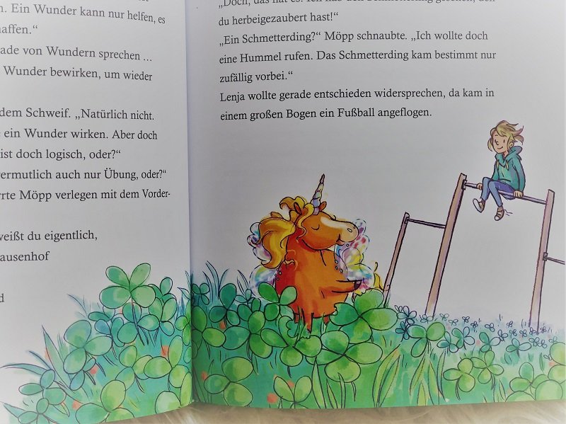 Möpp animiert sie, indem er ihr verspricht, dass er für ein Wunder sorgt, wenn sie nur genug übt und immer am Ball bleibt. Lenja versucht alles in ihrer Macht stehende, glaubt aber nicht, dass sie es schafft. Allerdings muss man schon an sich glauben, um ein Wunder zu erleben und das ist die Botschaft in diesem Buch. Nur wer an sich selber glaubt, kann es auch schaffen. Auch Möpp schafft es immer noch nicht zu zaubern, aber das mit dem üben ist so eine Sache… Lenja motiviert Möpp und erzählt ihm das gleiche, wie er ihr. So haben beide ihr Päckchen zu tragen, aber solange sie füreinander da sind, ist alles nur halb so schlimm.