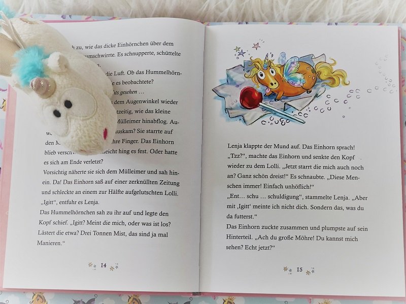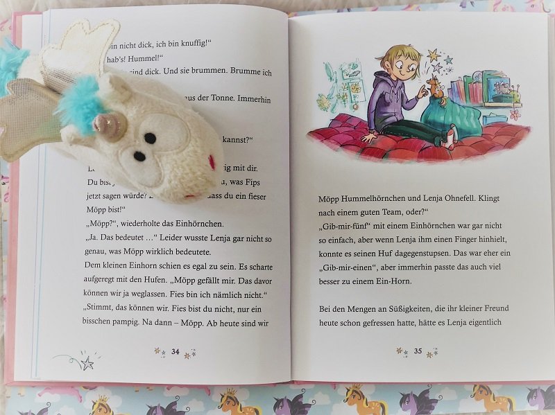 Zuerst gehe ich, wie immer, auf die Altersangabe ein. Um die Pointen richtig zu verstehen ist die Altersangabe sehr gut gewählt. Meine Große (bald 7) hat diese schon alle ganz gut verstanden und oft mit mir gelacht. Die Kleine mit 4 fand die Geschichte süß, weil ein Einhorn darin vorkommt und weil sie auch ein kleines Hummelhörnchen hat (siehe Bilder) aber die Witze und Hintergründe verstand sie noch nicht. Manchmal hat sie auch gar nicht richtig zugehört.