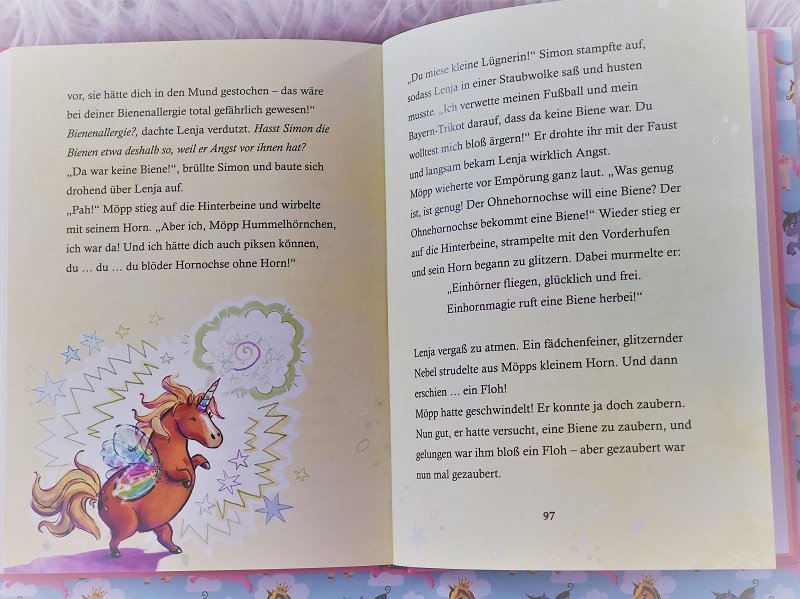 “Aber ich mache dir einen Vorschlag: Du isst morgen Dinkelflocken, Heu und Bio-Möhren. und übermorgen nehme ich dich mit zu Fips´ Geburtstagsparty. Da gibt es Kuchen.” Möpp möpperte zwar noch ein bisschen und wollte auf gar keinen Fall ein Bio-Einhorn sein. Aber die Aussicht, am Samstag mit Kuchen belohnt zu werden, versöhnte ihn dann doch. Als er später neben Lenjas Kopfkissen schlief und leise schnarchte, streichelte sie behutsam sein weiches braunes Fell mit der Fingerspitze. Unglaublich, dachte sie. Ich habe ein Einhorn, ein echtes Einhorn. es ist zwar ein bisschen verschnüppt und vermöppt, aber es ist dabei so niedlich, dass man es einfach nur lieb haben kann. (Zitat: Seite 47)
