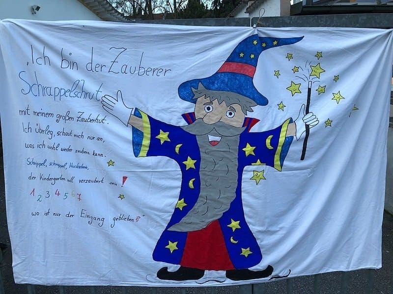 Am Mittwoch begannen dann im Kindergarten die Faschingsmottotage. Den Anfang machte der Hexen- und Zauberertag. Als wir vor dem Kindergarten parkten, war das Tor verschlossen und es hing ein riesiges Banner dort, auf dem stand: