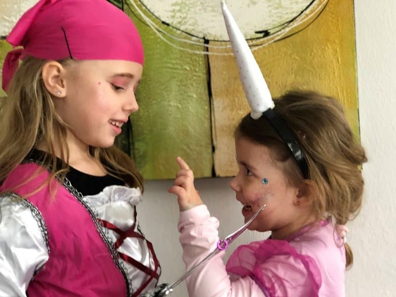 Am liebsten hätten sie sich schon morgens verkleidet und geschminkt, aber dann wäre am Nachmittag wohl nicht mehr viel davon übrig gewesen. Mittag durften sie dann endlich ihre neuen Kostüme anziehen. IB hat sich dieses Jahr für ein Piratenmädchen entschieden und ML für ein Einhorn. Das Einhorn war tatsächlich ein Unikat und ich dachte schon, in diesem Jahr gibt es an Fasching bestimmt einige Einhörner. Aber sie war wirklich die Einzige. Abends waren sie natürlich fix und fertig und sind nach der Badewanne todmüde ins Bett gefallen.
