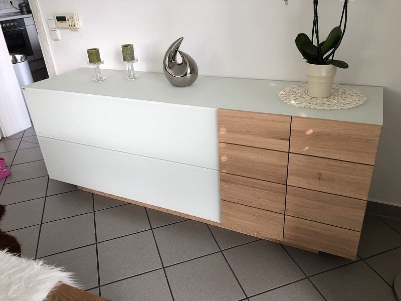 Nachmittag wurde endlich unser neues Sideboard geliefert. Ich finde es super schön und es passt eine Menge rein. Da wir vorher an der Stelle einen hohen Schrank stehen hatten, fehlt jetzt noch ein Bild an der Wand, also nicht wundern, warum es so kahl aussieht.