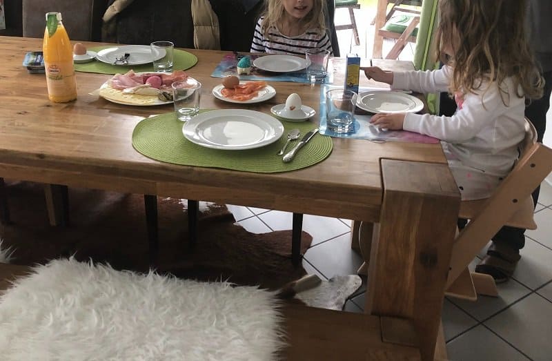 Am Ostersonntag haben wir nach dem Aufstehen erstmal ein richtiges Osterfrühstück gemacht. Wir sind ja eigentlich nicht so die Frühstücksmenschen, aber an Ostern muss das schon sein. Es gab natürlich die selber gefärbten Eier der Mädels und sonst alles was zu einem Frühstück dazu gehört. Viel haben wir nicht geschafft, bis auf meinem Mann, der kann immer essen, egal zu welcher Tageszeit, was ich nie verstehen werde.