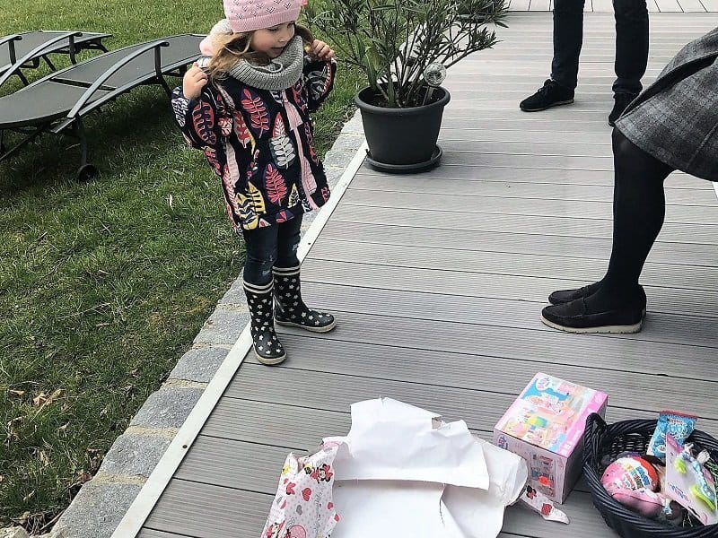 Die Mädels kennen den Osterhasen schon und so waren die Ostergeschenke schnell gefunden und ausgepackt. Es war wirklich bitterkalt und für richtig gemeine Verstecke hatte ich gar keine Lust, sonst hätten wir alle noch länger draußen bleiben müssen. Aber Hauptsache war ja, dass der Osterhase überhaupt was dagelassen hat bei dem Wetter, denn das war ja schon die Befürchtung von den Zweien, dass es sogar dem Osterhasen zu kalt ist.