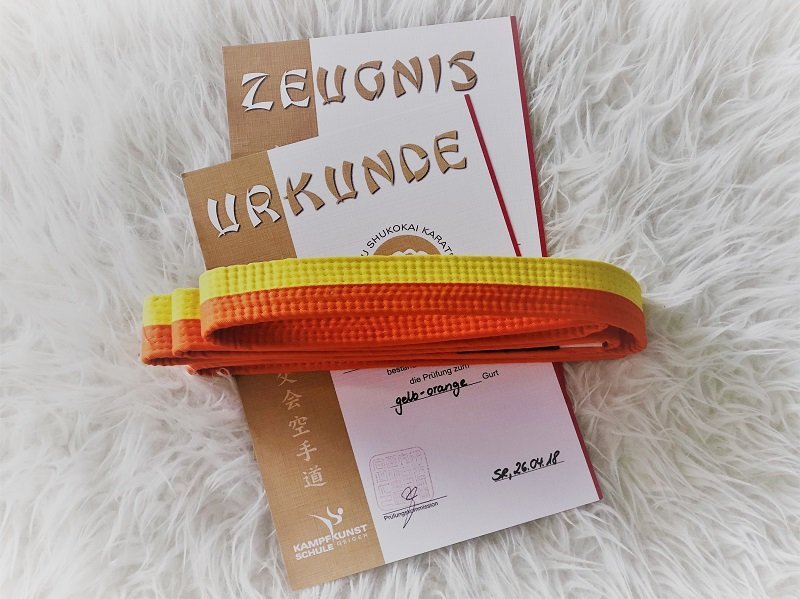 FrühlingNachmittag war es dann soweit. IB hatte um 17.30 ihre Gürtelprüfung und sie war dieses Mal eigentlich gar nicht so aufgeregt. Aber durchgefallen ist bis jetzt bei den kleineren Kindern eh noch niemand, also alles gut. Ich habe beim Karate schon lange nicht mehr zugesehen, aber ich muss sagen, was IB da jetzt schon macht, schaut wirklich gut aus. Sie kann es jetzt auch schon teilweise zu Hause, alleine vormachen und merkt sich die Abfolge der Katas. Sie hat toll mitgemacht und sich ihren gelb-orange Gürtel redlich verdient.