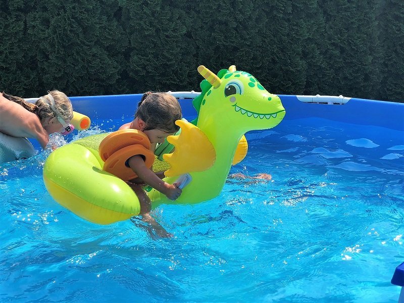 Einen Vormittag gingen die Mädels mit der Oma in den Stadtpark. Dort waren sie im Wassertretbecken und auf dem Spielplatz. Einmal wollten wir ins Freibad, allerdings hatten die Kids keine Lust, weil wir die Schwimmtiere aufgeblasen haben und sie damit im Pool spielen wollten. Ins Freibad mitnehmen ist, glaube ich, nicht so eine gute Idee, bei dem derzeitigen Andrang dort.