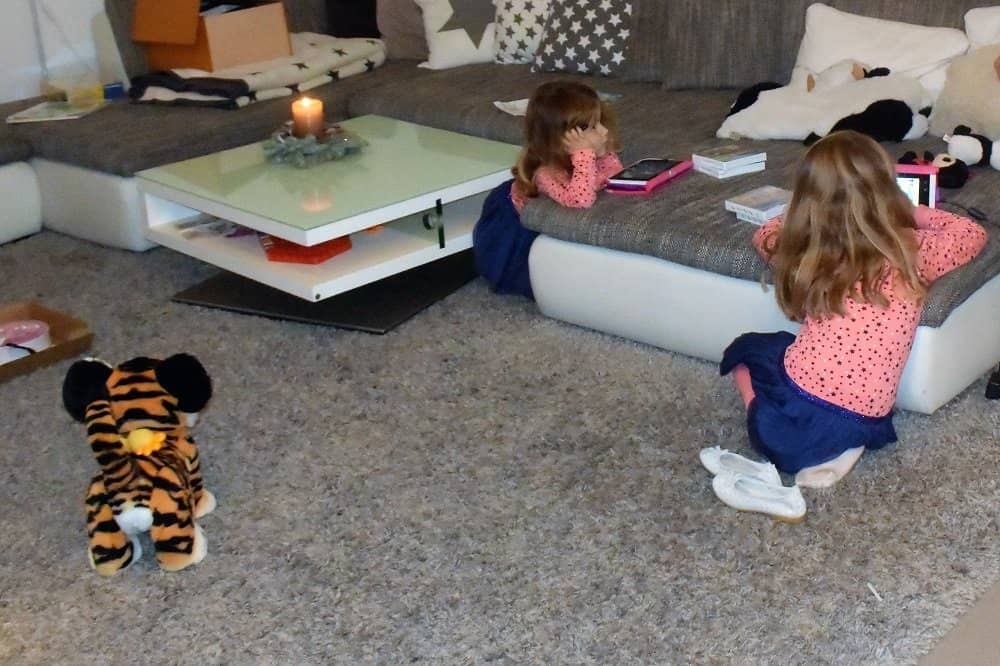 Vormittags sind die Mädels mit dem Papa kurz zur Oma gefahren. Mittag kam meine Mama und hat die beiden fürs Kino abgeholt. So konnten wir in Ruhe den Baum schmücken (bei uns schmückt den das Christkind, deshalb dürfen sie ihn nicht sehen) und alles herrichten. Nachmittag hatten wir sogar noch Zeit für 1 Std. ausruhen auf der Couch. Um ca. halb sechs sind sie dann wieder gekommen und es war Bescherung. Die Mädels haben sich riesig über ihre Geschenken gefreut. Den V-Tech Storio Max legen sie gar nicht mehr weg. Taylor der Königstiger ist wirklich goldig. Mit dem habe ich schon mehr gespielt, als meine Tochter.
