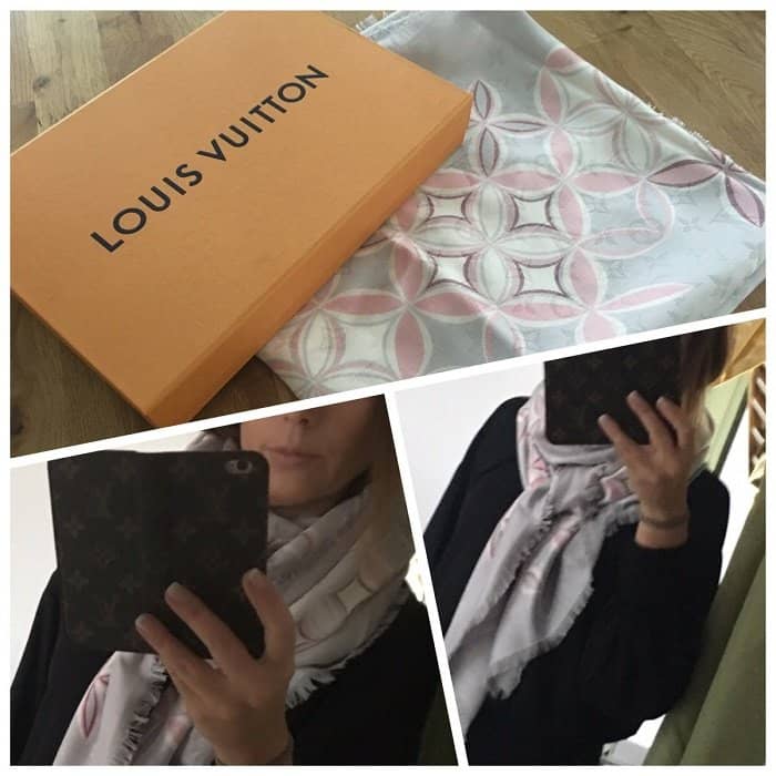 Normalerweise fange ich ja immer mit dem Montag an, dieses Mal beginne ich natürlich mit dem Hl. Abend also Sonntag. Wir hatten einen schönen Hl. Abend. Ich hatte ja auch Geburtstag und bin jetzt wieder ein Jahr älter – leider. Vormittags haben wir eigentlich nichts großartiges gemacht. Ich habe viele Nachrichten geschrieben, da mir natürlich viele zum Geburtstag gratuliert haben und war ein paar Mal am Telefon. Mein Mann hat mir mein Geburtstagsgeschenk gegeben. IB hat mir das zwar schon verraten, aber in natura ist er noch viel schöner. Der neue Louis Vuitton Schal in grau und rosa.