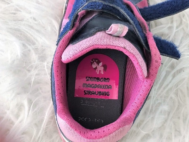 Die Schuhaufkleber zieht man ab und man merkt, dass die Klebeseite einfach anders ist, als bei den großen Namensaufkleber. Ich habe einen Schuh innen in der Sohle beklebt und bis jetzt hält der Aufkleber bombenfest. Wie es nach längerer Benutzung aussieht kann ich natürlich noch nicht beurteilen, aber bis jetzt machen die Namensaufkleber für Schuhe einen guten, haltbaren Eindruck. Ich werde die auf alle Fälle im neuen Kindergartenjahr für die Hausschuhe und Turnschuhe nutzen. Dieses Jahr mache ich es nicht mehr, denn für die alten Hausschuhe und Turnschuhe, die eh nicht mehr lange passen, sind mir die Etiketten jetzt zu schade.