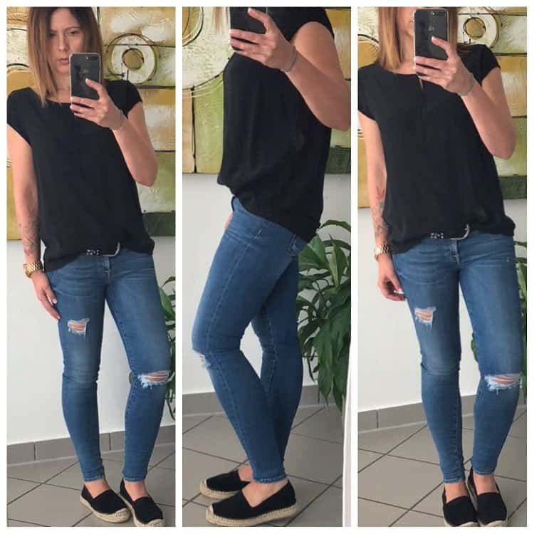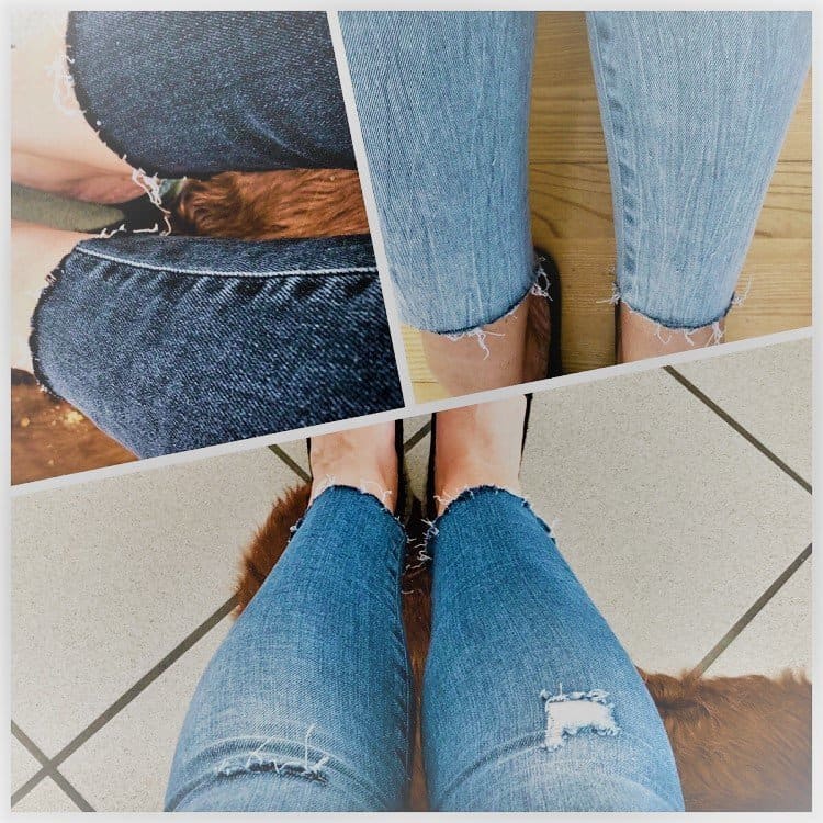 Ich habe gefühlte 100 probiert. Im Geschäft und von Onlinebestellungen. Keine hat mich überzeugt. Da fiel mir ein, dass ich in einem Karton noch aussortierte Jeans habe, die eigentlich noch zu Ebay sollten. Dort drin war eine mittelblaue mit Löcher und ich dachte, die schneide ich jetzt einfach ab. Es hat ein wenig gedauert, bis ich es wirklich getan habe, denn es war ne 7 for all mankind und die sind nicht gerade billig. Was ist, wenn ich sie versaue? Habe es trotzdem gemacht. Schere her, Saum ab und ein wenig die Fransen raus gezogen, was sich hoffentlich nach dem Waschen noch verstärkt, denn das habe ich mir dann doch nicht so getraut. Auf jeden Fall war ich begeistert von dem Ergebnis und habe aus meiner Kiste gleich noch 2 Jeans (hellgrau und schwarz) heraus geholt und abgeschnitten und so sieht das jetzt aus. Die Fransen müssen nur noch mehr werden.