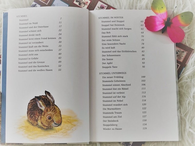 Der Schreibstil von Stummel – ein Hasenkind wird groß, ist leicht und flüssig zu lesen. Das Buch ist in viele kleine Kapitel bzw. Geschichten eingeteilt, was es für die Kleinen viel einfacher macht das Geschriebene zu verstehen. Jedes Kapitel ist abgeschlossen und doch geht dann die Geschichte genau an diesem Punkt weiter. So also bestens als Gute-Nacht-Geschichte geeignet, da man 1 oder 2 Kapitel lesen kann, die auch ein Ende haben, sich die Kinder am nächsten Tag aber trotzdem an die letzte Geschichte erinnern müssen um wieder einen Anschluss zu finden.